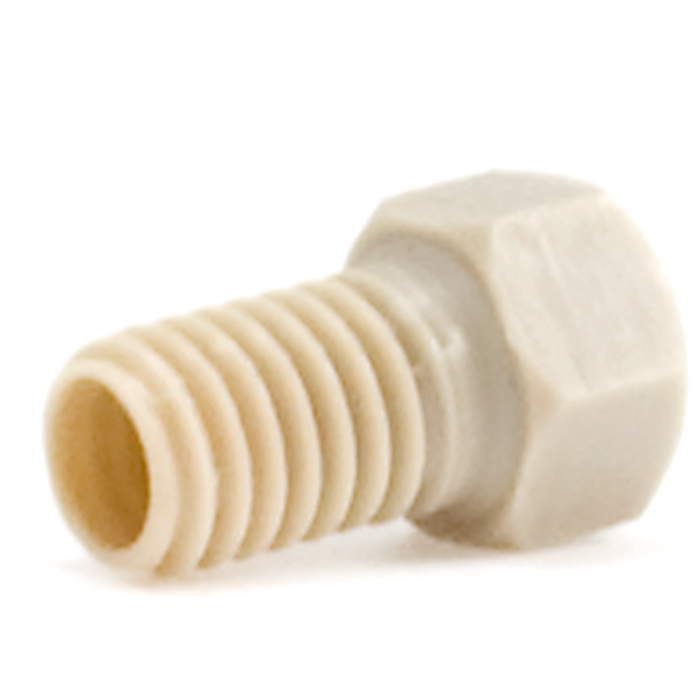 Tubing Connector Nuts, high pressure, two pieces, 1/16 inch, PEEK, Natural, small hex head, short length and 10-32 screw threads. Use with double cone ferrules. Wrench tighten, ARE-Applied Research brand. Bulk Price.