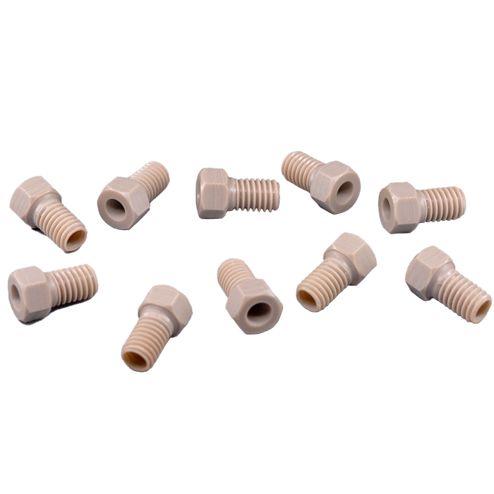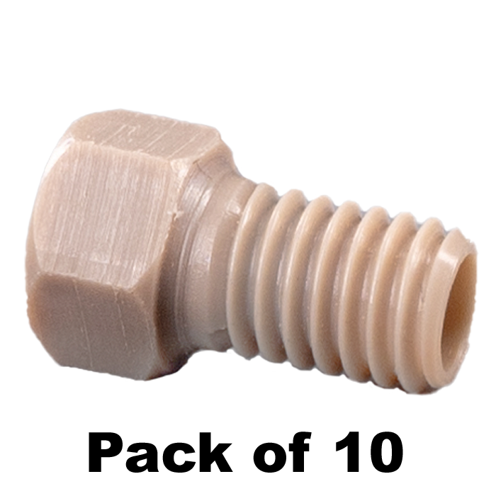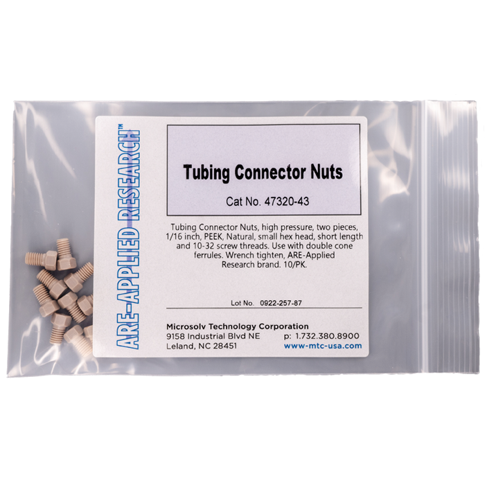 Tubing Connector Nuts, high pressure, two pieces, 1/16 inch, PEEK, Natural, small hex head, short length and 10-32 screw threads. Use with double cone ferrules. Wrench tighten, ARE-Applied Research brand. 10/PK.