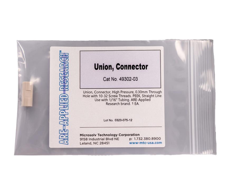 Union, Connector, high pressure, 0.30 mm / 0.012 inch through hole with 10-32 screw threads. PEEK, straight line. ARE-Applied Research brand. Bulk Price.