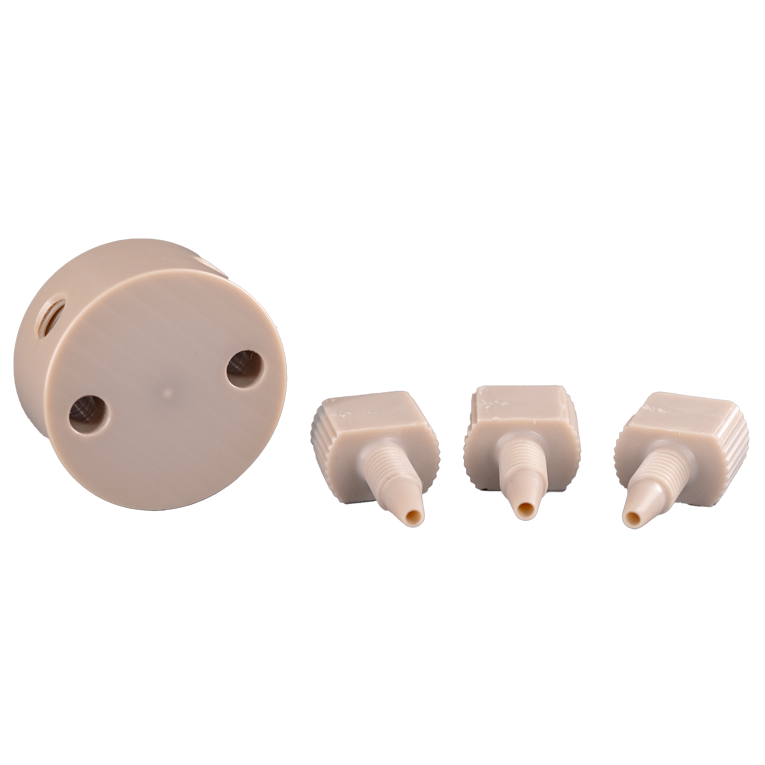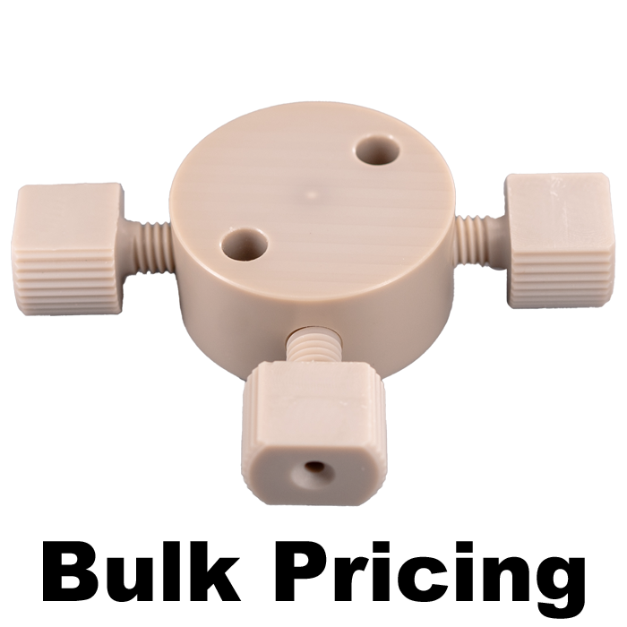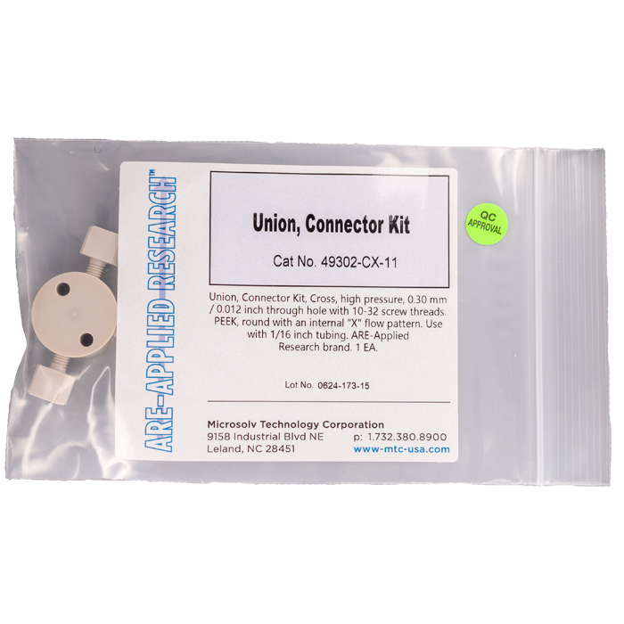 Union, Connector Kit, Cross, high pressure, 0.30 mm / 0.012 inch through hole with 10-32 screw threads. PEEK, round with an internal "X" flow pattern. Use with 1/16 inch tubing. ARE-Applied Research brand. Bulk Price.