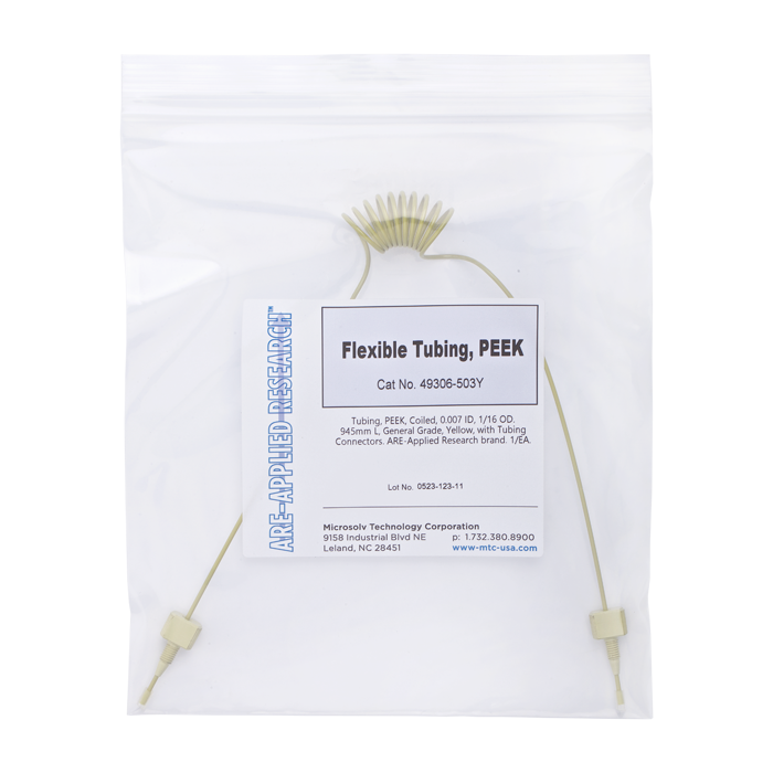Tubing, PEEK, Coiled, 0.007 (0.18 mm) ID, 1/16th inch (1.6 mm) OD. 945 mm length, HPLC grade, solid yellow, with tubing connectors. ARE-Applied Research brand. 1 EA.