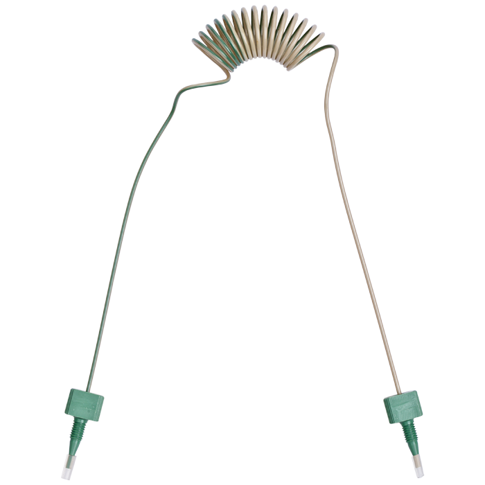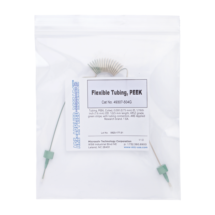 Tubing, PEEK, Coiled, 0.030 (0.75 mm) ID, 1/16th inch (1.6 mm) OD. 1225 mm length, HPLC grade, green stripe, with tubing connectors. ARE-Applied Research brand. 1 EA.