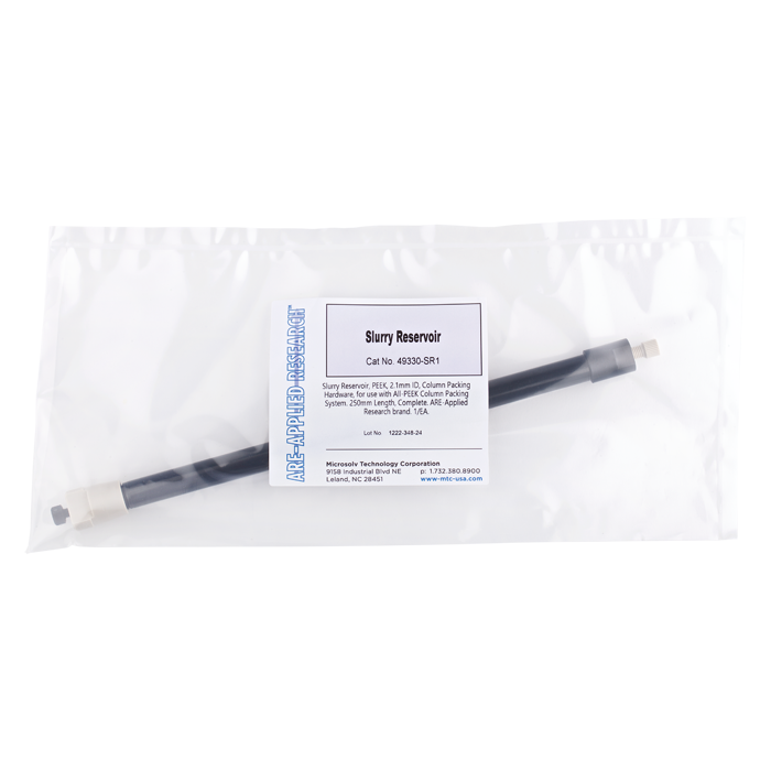 Slurry Reservoir Kit, All-PEEK, for packing 2.1 mm ID columns that are longer than 100 mm in length. Reservoir is 250 mm long with a 4.6 mm ID, complete with all parts and accessories needed to pack bioinert, All-PEEK columns. ARE-Applied Research brand. 1 EA.