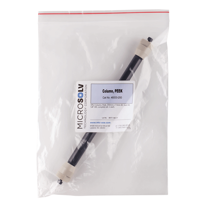 HPLC Column Set, PEEK with a 7.5 mm ID. Includes, a 250 mm x 7.5 mm black, column body tube (5/8-18 threads), plus 2 PEEK 5 um frits, 2 frit spacers & 2 end fittings. ARE-Applied Research brand. 1 EA.