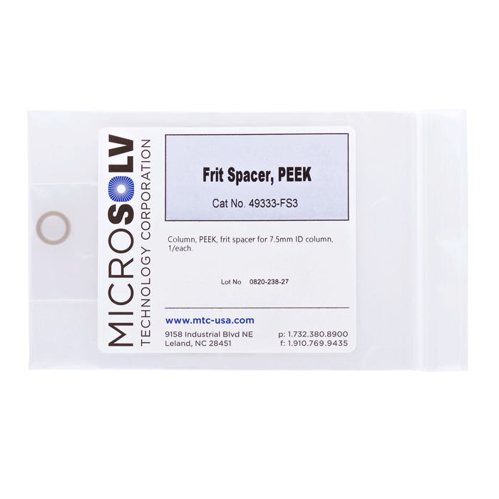 This All-PEEK frit spacer is a replacement part for all 7.5 mm ID columns and is also used when packing 4.6 or 7.5 mm ID columns.