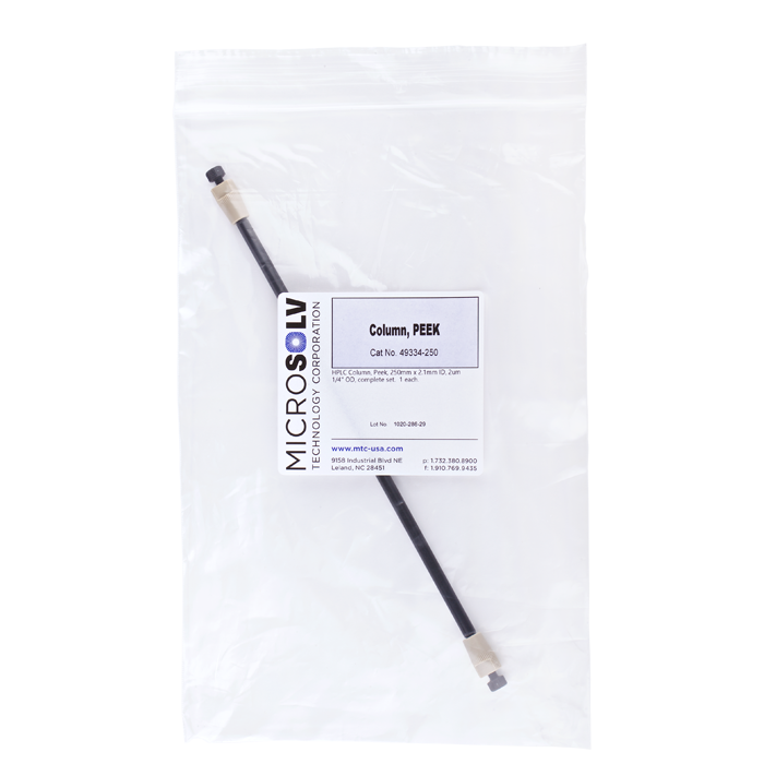 HPLC Column Set, PEEK with a 2.1 mm ID. Includes, a 250 mm x 2.1 mm black, column body tube (1/4-28 threads), plus 2 PEEK 2 um frits & 2 end fittings. ARE-Applied Research brand. 1 EA.