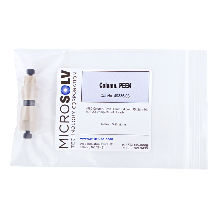 HPLC Column Set, PEEK with a 4.6 mm ID. Includes, a 30 mm x 4.6 mm black, column body tube (1/2-20 threads), plus 2 PEEK 2 um frits & 2 end fittings. ARE-Applied Research brand. 1 EA.
