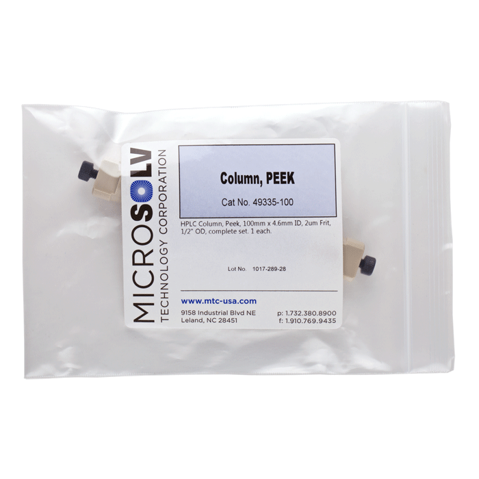 HPLC Column Set, PEEK with a 4.6 mm ID. Includes, a 100 mm x 4.6 mm black, column body tube (1/2-20 threads), plus 2 PEEK 2 um frits & 2 end fittings. ARE-Applied Research brand. 1 EA.