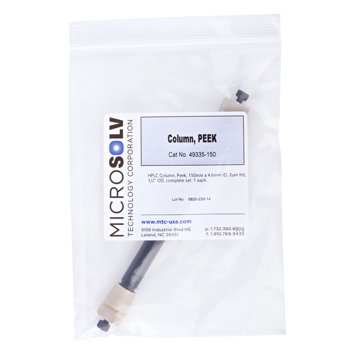 HPLC Column Set, PEEK with a 4.6 mm ID. Includes, a 150 mm x 4.6 mm black, column body tube (1/2-20 threads), plus 2 PEEK 2 um frits & 2 end fittings. ARE-Applied Research brand. 1 EA.