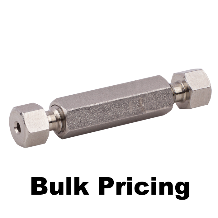Union, Connector Kit, high pressure, 0.50 mm / 0.020 inch through hole with 10-32 mm screw threads. Stainless steel, straight line. Use with 1/16 inch tubing. ARE-Applied Research brand. Bulk Price.