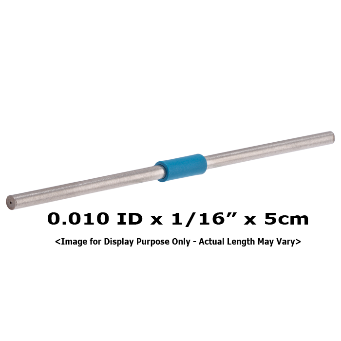 Tubing, Stainless Steel, Pre-Cut, 0.010 inch (0.25 mm) ID, 1/16 inch (1.60 mm) OD, HPLC grade, blue band, 5 cm long. ARE-Applied Research brand. 1 EA.
