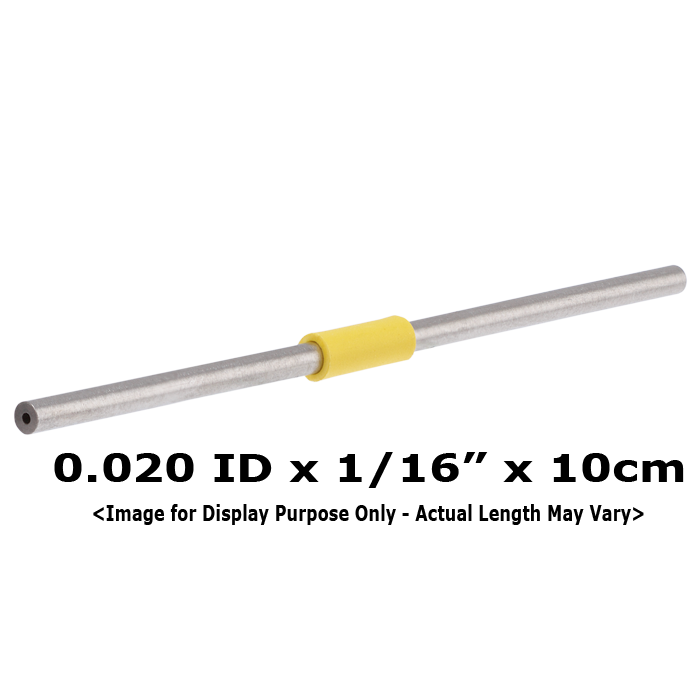 Tubing, Stainless Steel, Pre-Cut, 0.020 inch (0.50mm) ID, 1/16 inch (1.60 mm) OD, HPLC grade, yellow band, 10 cm long. ARE-Applied Research brand. 1 EA.
