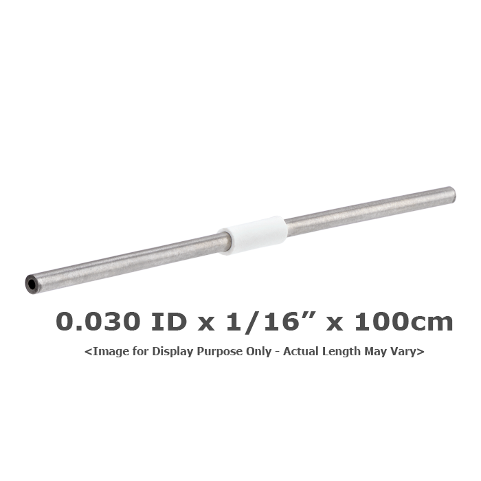 Tubing, Stainless Steel, Pre-Cut, 0.030 (0.75 mm) inch ID, 1/16 inch (1.60 mm) OD, HPLC grade, white band, 100 cm long. ARE-Applied Research brand. 1 EA.