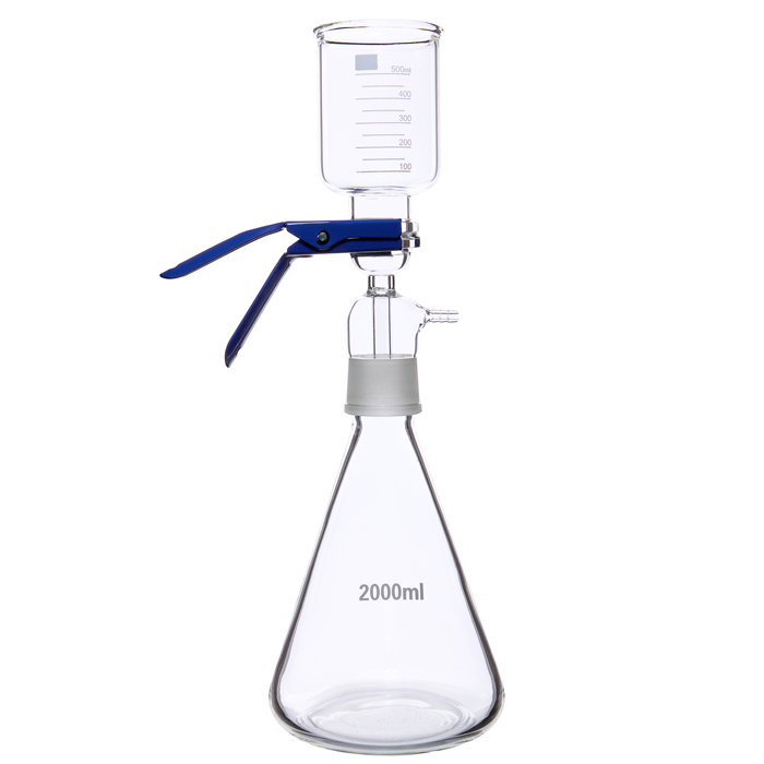 The unit'™s design of the fritted glass support for the membrane also prevents contamination of your vacuum line or source which is separate from this unit. The funnels are graduated and will hold up to 500mL of mobile phase. The reservoir flasks holds 2,000mL and the narrow mouth opening minimizes out-gassing. Use any disposable, 47mm membrane disc that is compatible with your mobile phase. The Filter Degasser Assembly is sold as a complete kit including the blue metal clamp. Replacements parts are available upon request. Membranes are sold separately.