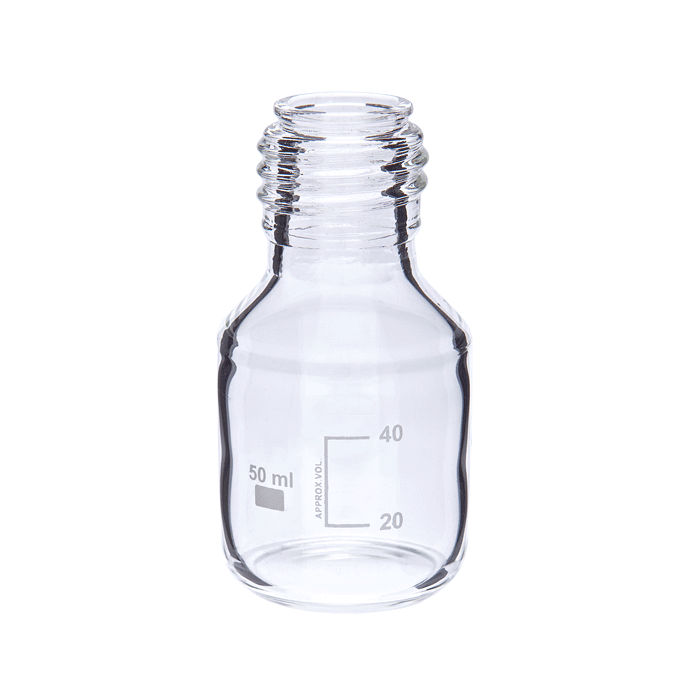 This Clear, Borosilicate Glass Bottle with a 50 mL "Total Fill Capacity" is an essential tool for any laboratory. Its durable Hybex™ borosilicate glass construction and precise white enamel graduations make it perfect for use as an HPLC mobile phase storage bottle.