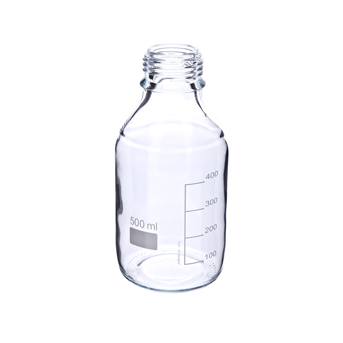 This Clear, Borosilicate Glass Bottle with a 500 mL "Total Fill Capacity" is an essential tool for any laboratory. Its durable Hybex™ borosilicate glass construction and precise white enamel graduations make it perfect for use as an HPLC mobile phase storage bottle.