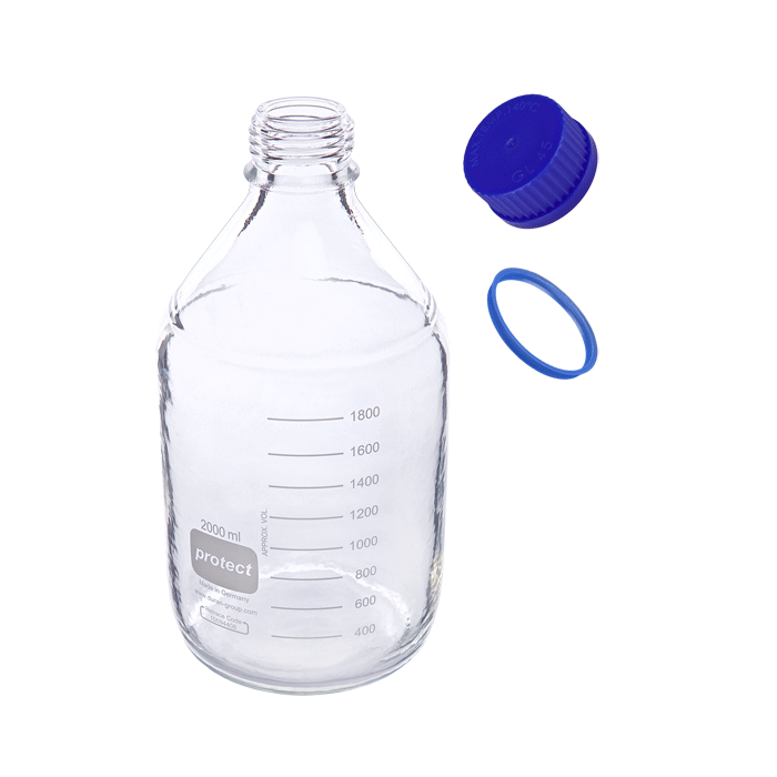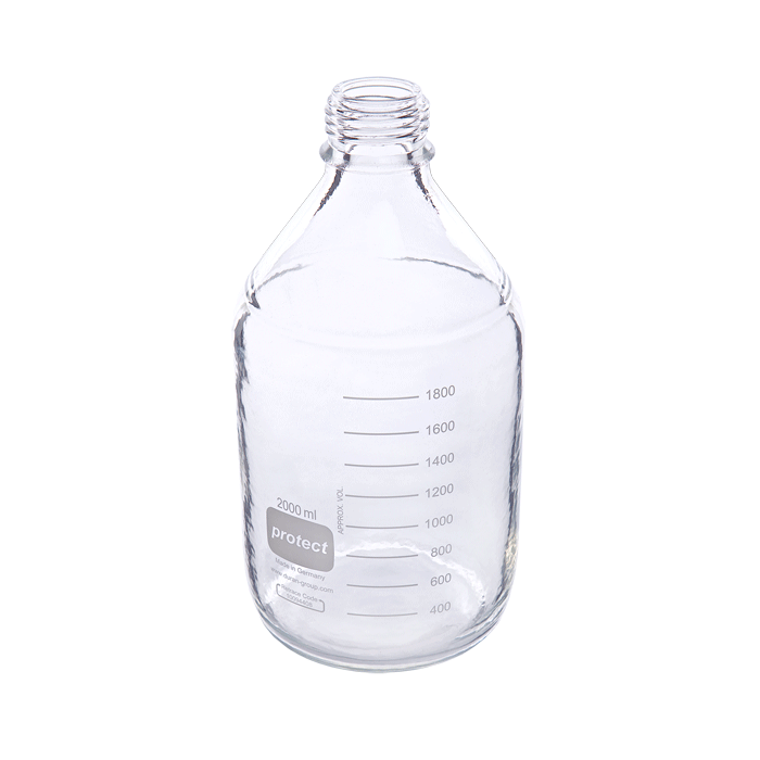 One of our Most Popular Items, this Clear, Plastic Coated, Borosilicate Glass Bottle has a 2L "Total Fill Capacity" and is perfect as an HPLC Mobile Phase Reservoir. The small opening, one liter Capacity and White Enamel Graduations on the outside of the Bottle help you determine the Solvent use and prevent running dry.