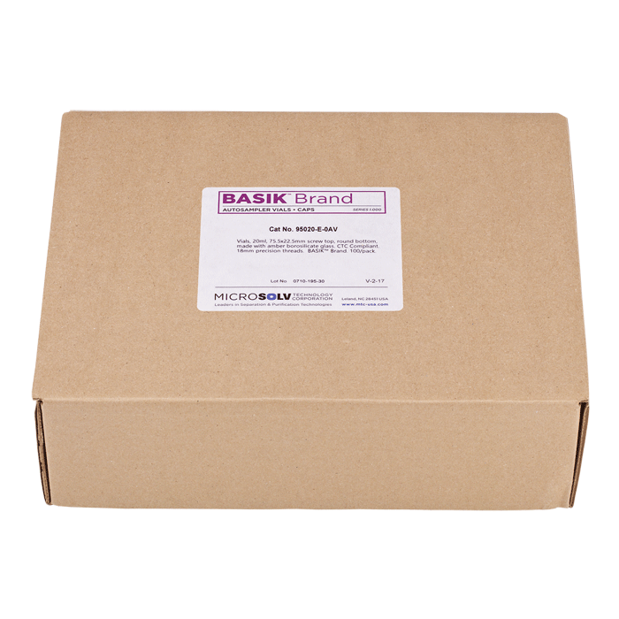 Vials, Headspace, Screw Top, Glass. Amber, 20ml, 18mm precision threads, 22.5x75.5mm outer dimensions, Rounded Bottom. CTC Compliant. BASIK Brand. 100/PK.