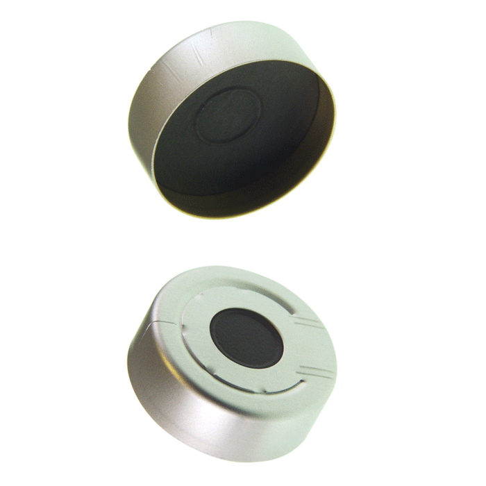 Caps, Headspace, Crimp Top, with Dark Grey Butyl Rubber Septa, fitted in Aluminum, Silver Pressure Relief Caps with 10mm center holes. For use with 20mm Crimp Top Headspace Vials. MICROSOLV Brand. 100/PK.