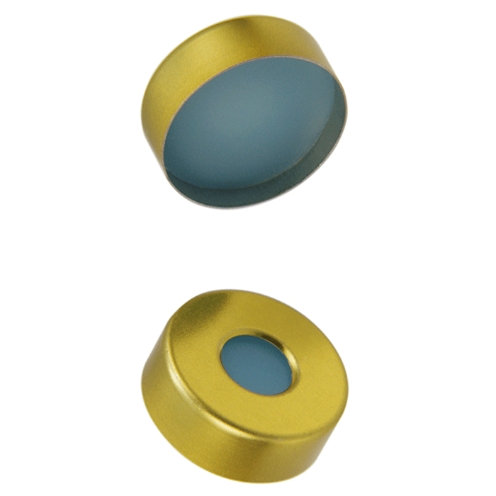 Caps, Headspace, Crimp Top, with Transparent Blue Silicone Rubber / Transparent PTFE Septa, fitted in Steel, Magnetic, Gold Caps with 8mm center holes. For use with 20mm Crimp Top Headspace Vials. MICROSOLV Brand. 100/PK.