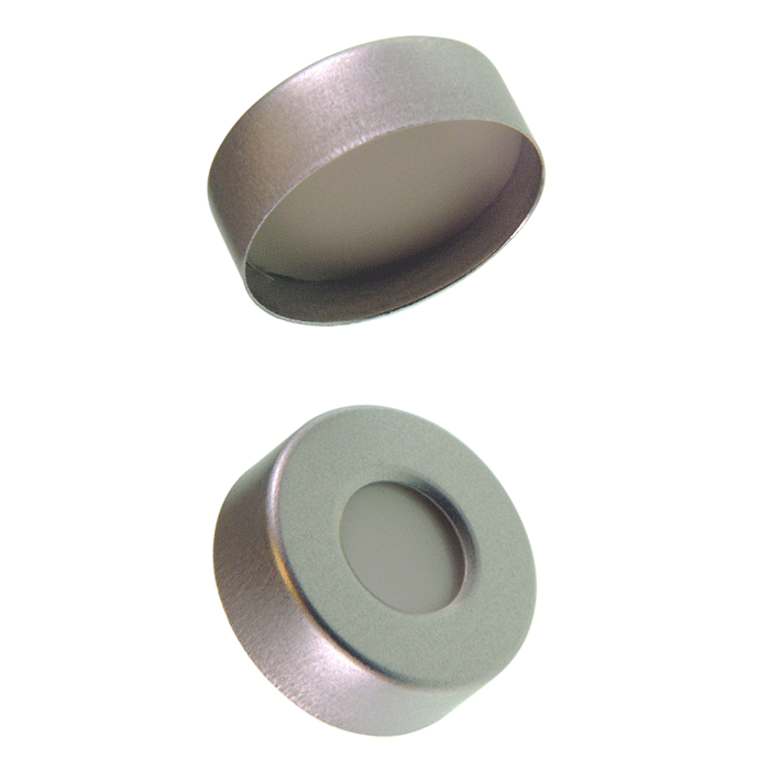 Caps, Headspace, crimp top, with white silicone rubber / white PTFE, high purity septa, fitted in aluminum silver caps with 10 mm center holes. For use with 20 mm crimp top headspace vials. BASIK brand. 100/PK.