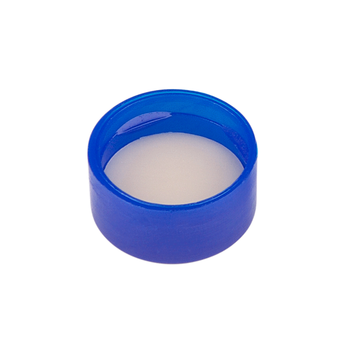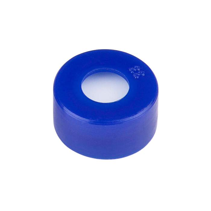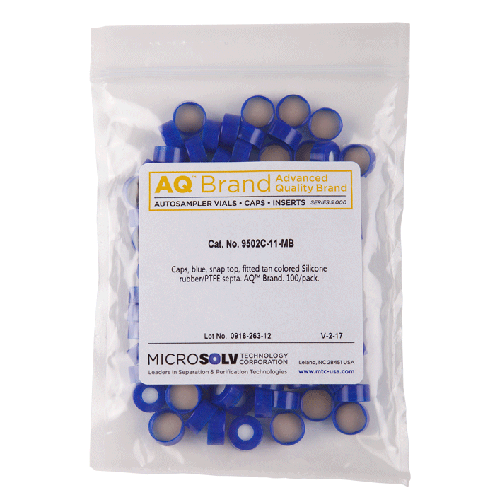 Caps, Snap Top, with White Silicone Rubber / Tan PTFE Septa, fitted in smooth, polyethylene, Blue Caps. For use with 11mm, 12x32mm Snap Top autosampler vials. AQ Brand. 100/PK.