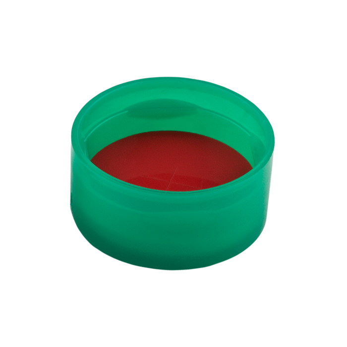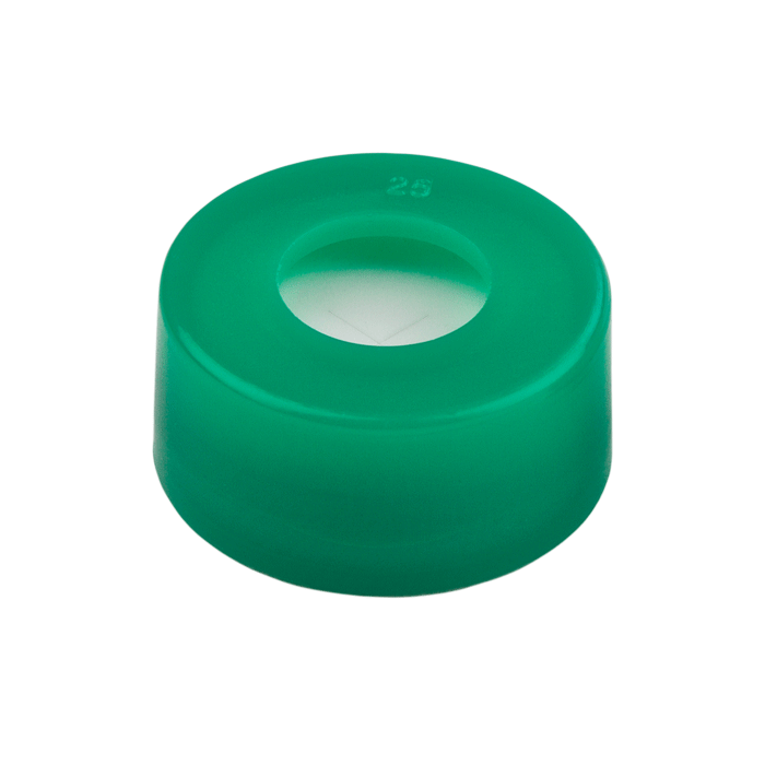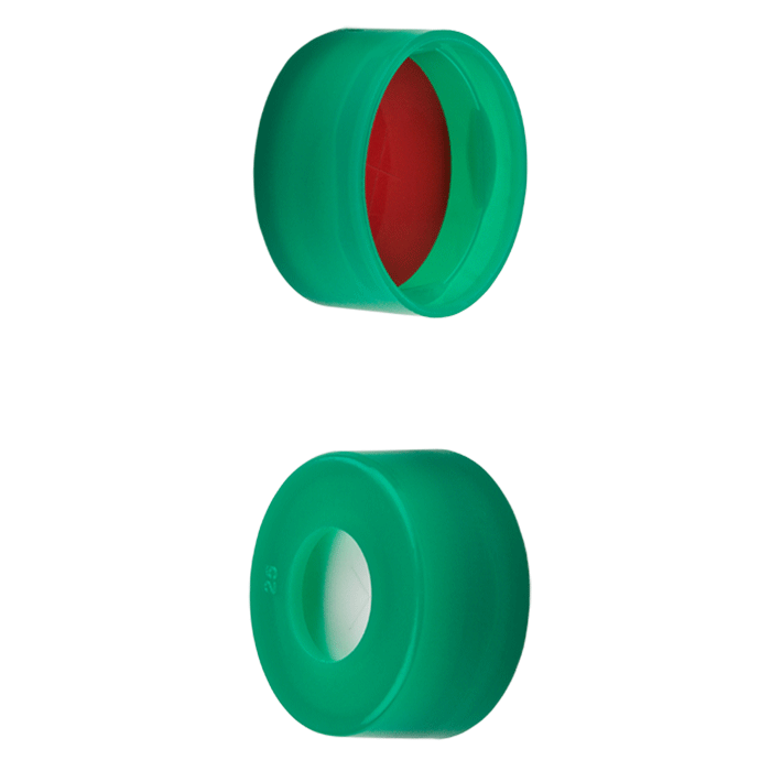 Caps, Snap Top, with Red PTFE / White Silicone Rubber / Red PTFE Septa, fitted in smooth, polyethylene, Green Caps. For use with 11mm, 12x32mm Snap Top autosampler vials. MICROSOLV Brand. 100/PK.