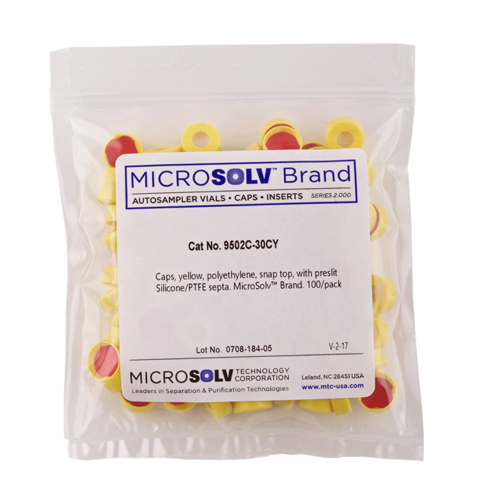 Caps, Snap Top, with Silicone Rubber / PTFE Pre-Slit Septa, fitted in smooth, polyethylene, Yellow Caps. For use with 11mm, 12x32mm Snap Top autosampler vials. MICROSOLV Brand. 100/PK.