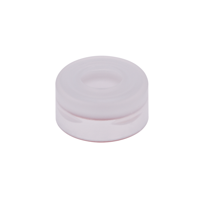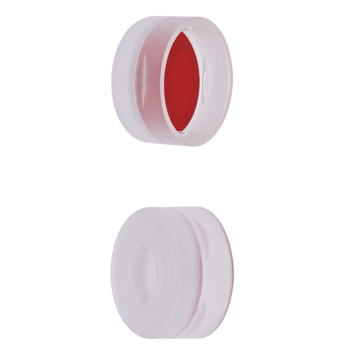 Caps, Snap Top, with Soft-Guard, White Silicone Rubber / Red PTFE Septa, fitted in smooth, polyethylene, Natural Transparent Caps. For use with 11mm, 12x32mm Snap Top autosampler vials. Soft-Guard Brand. 1000/CS.