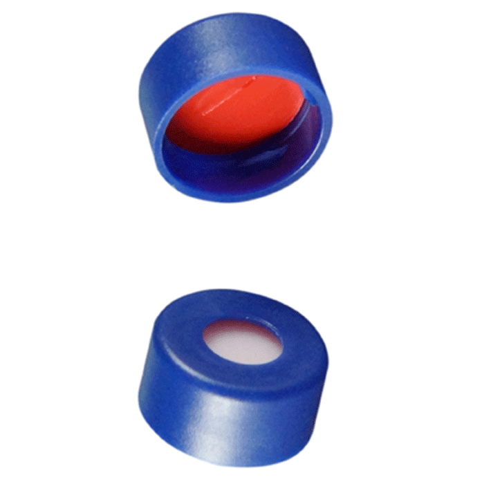 Caps, Snap Top, with Soft-Guard, White Silicone Rubber / Red PTFE Pre-Slit Septa, fitted in smooth, polyethylene Blue Caps. For use with 11mm, 12x32mm Snap Top autosampler vials. Soft-Guard Brand. 1000/CS.