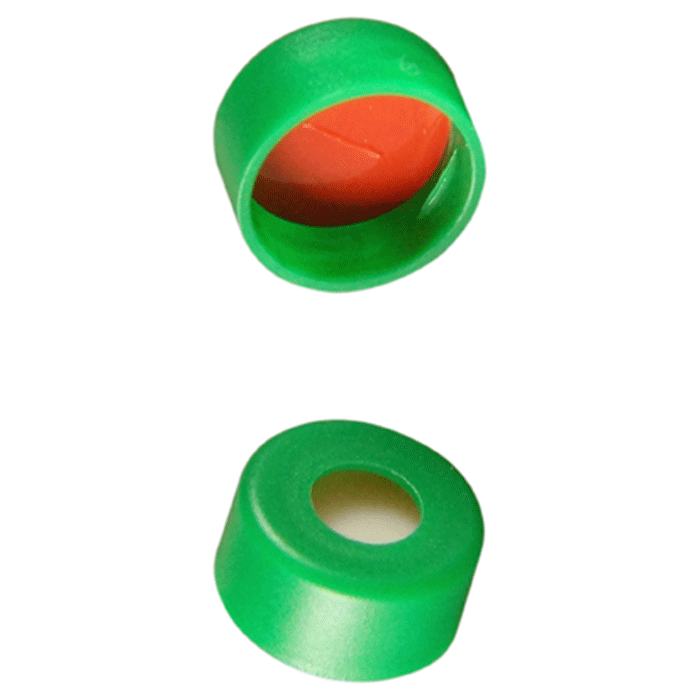 Caps, Snap Top, with Soft-Guard, White Silicone Rubber / Red PTFE Pre-Slit Septa, fitted in smooth, polyethylene, Green Caps. For use with 11mm, 12x32mm Snap Top autosampler vials. Soft-Guard Brand. 1000/CS.