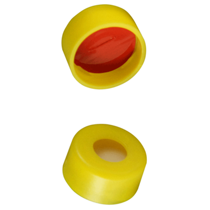 Caps, Snap Top, with Soft-Guard, White Silicone Rubber / Red PTFE Pre-Slit Septa, fitted in smooth, polyethylene, Yellow Caps. For use with 11mm, 12x32mm Snap Top autosampler vials. Soft-Guard Brand. 100/PK.
