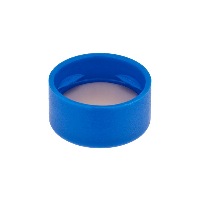 Caps, Snap Top, with 0.04" thick, White Silicone Rubber / Natural PTFE Pre-Slit Septa, fitted in smooth, polyethylene, Light Blue Caps. For use with 11mm, 12x32mm Snap Top autosampler vials. BASIK Brand. 1000/CS.