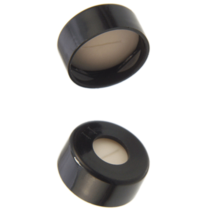 Caps, Snap Top, with 0.04" thick, White Silicone Rubber / Natural PTFE Pre-Slit Septa, fitted in smooth, polyethylene, Black Caps. For use with 11mm, 12x32mm Snap Top autosampler vials. BASIK Brand. 1000/CS.