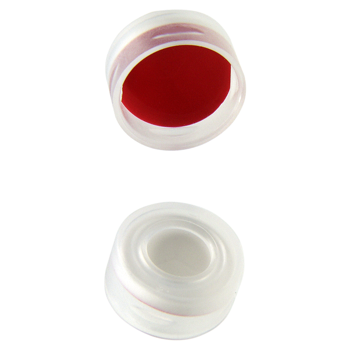 Caps, Snap Top, with 1.00mm thick, White Silicone Rubber / Red PTFE Pre-Slit (Y Shape) Septa, fitted in smooth, soft polyethylene, Natural Transparent Caps. For use with 11mm, 12x32mm Snap Top autosampler vials. MICROSOLV Brand. 100/PK.