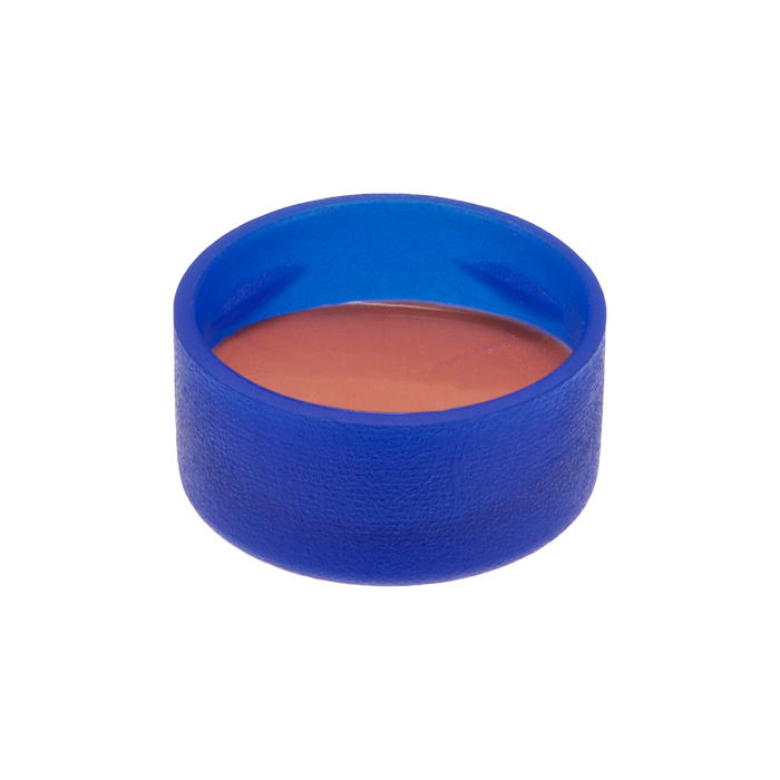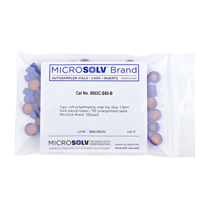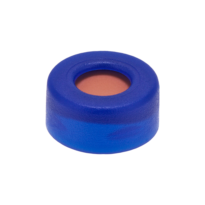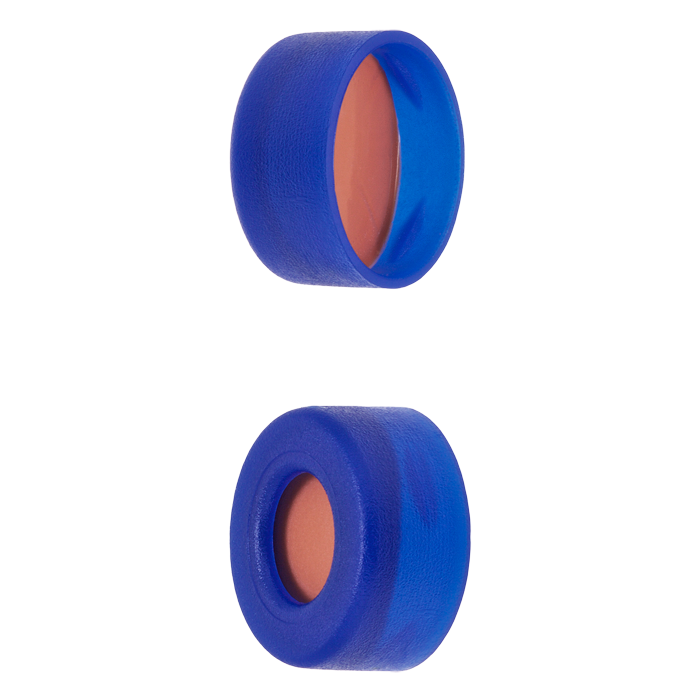 Caps, Snap Top, with 1.0mm thick, Orange Rubber / Transparent TEF Septa, fitted in Smooth, soft polyethylene, Blue Caps. For use with 11mm, 12x32mm Snap Top autosampler vials. MICROSOLV Brand. 100/PK.