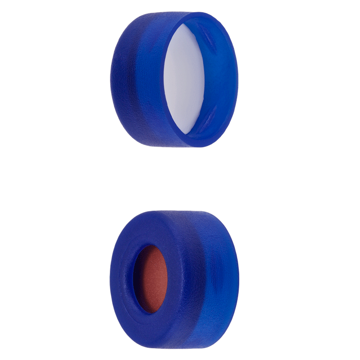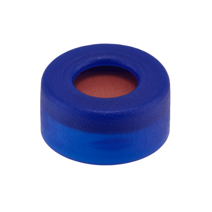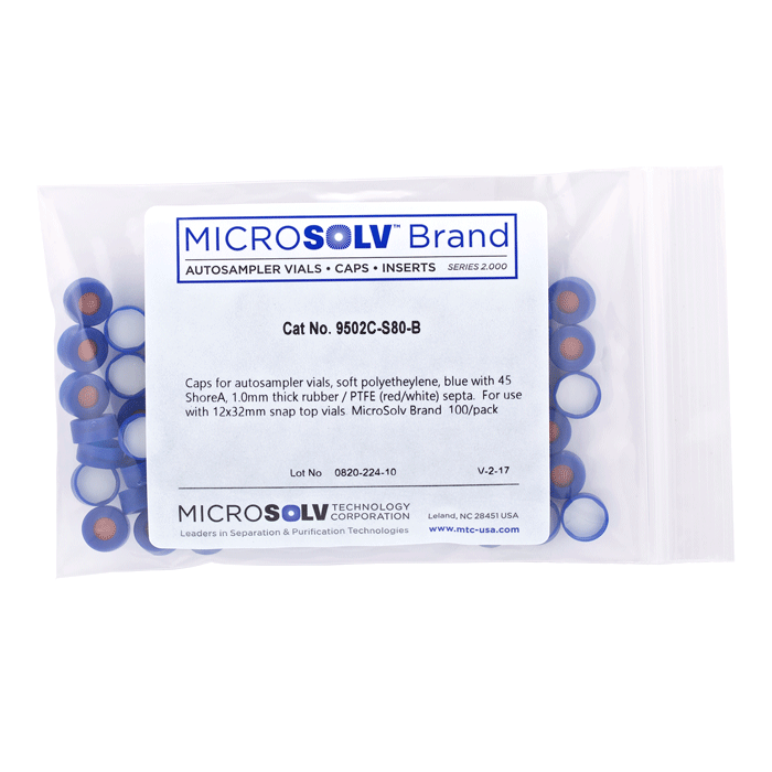 Caps, Snap Top, with 1.0mm thick, Red Rubber / Beige PTFE Septa, fitted in smooth, soft polyethylene, Blue Caps. For use with 11mm, 12x32mm Snap Top autosampler vials. MICROSOLV Brand. 100/PK.