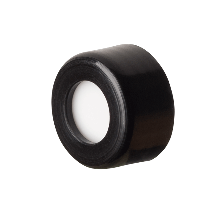 Caps, Screw Top, with Silicone Rubber / PTFE Septa, fitted in smooth sided, Robo Style, soft polypropylene, Black Caps. For use with 9-425mm thread, 12x32mm autosampler vials. BASIK Brand. 100/PK.