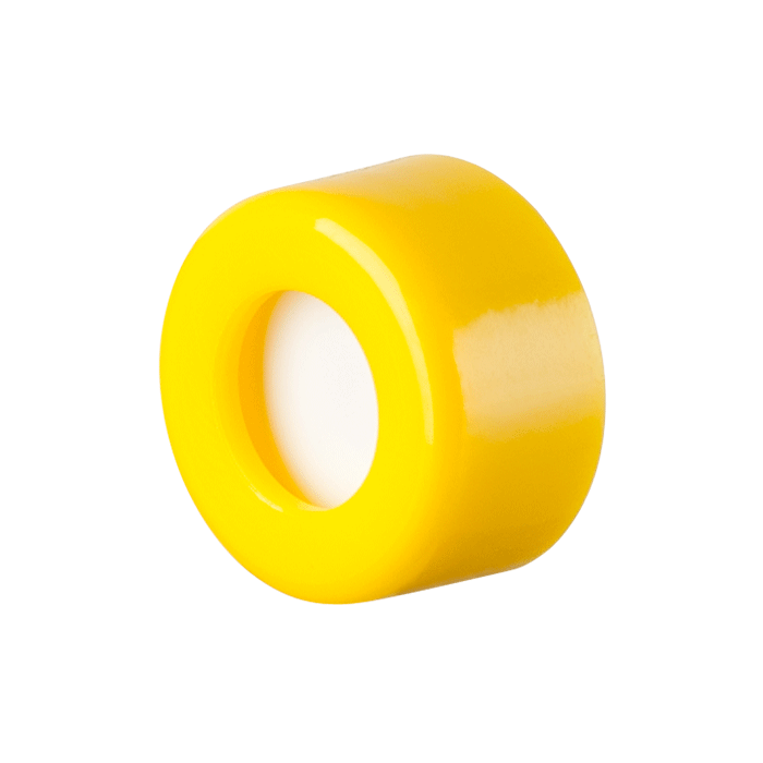 Caps, Screw Top, with Silicone Rubber / PTFE Septa, fitted in smooth sided, Robo Style, soft polypropylene, Yellow Caps. For use with 9-425mm thread, 12x32mm autosampler vials. BASIK Brand. 1000/CS.