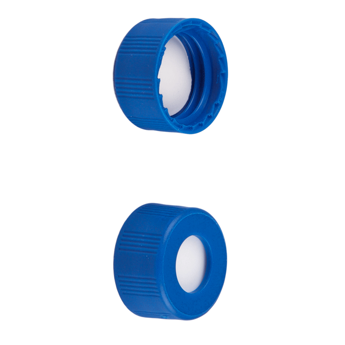 Our screw top caps are designed for use with 9-425mm thread, 12x32mm autosampler vials, providing a reliable and secure seal. The non-slit, white PTFE liner and white silicone rubber septa are fitted in knurled polypropylene blue caps, ensuring durability and ease of use.