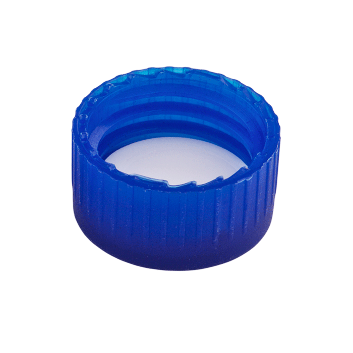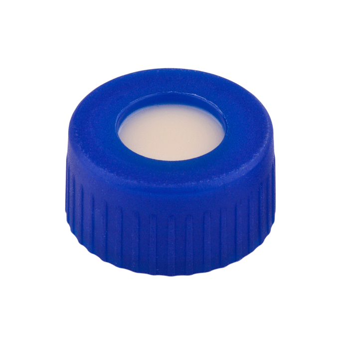 Caps, Screw Top, with Natural Silicone Rubber / White PTFE Septa, bonded in "knurled", polypropylene, Blue Caps. For use with 9-425 thread, 12x32mm autosampler vials. MICROSOLV Brand. 100/PK.