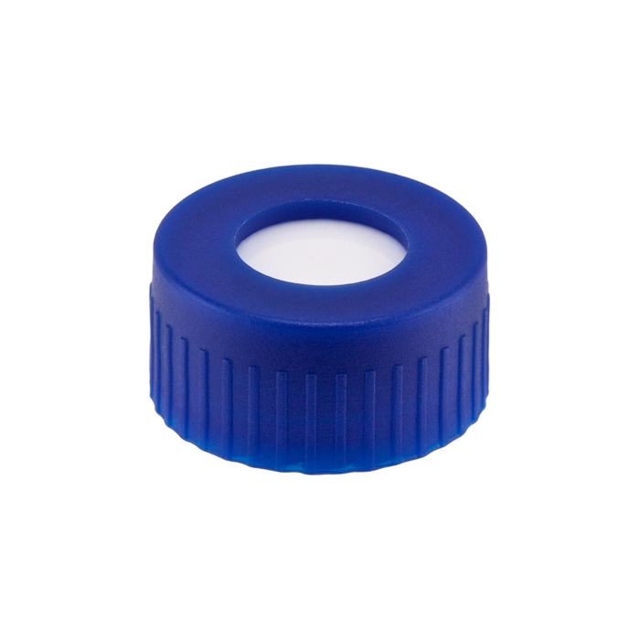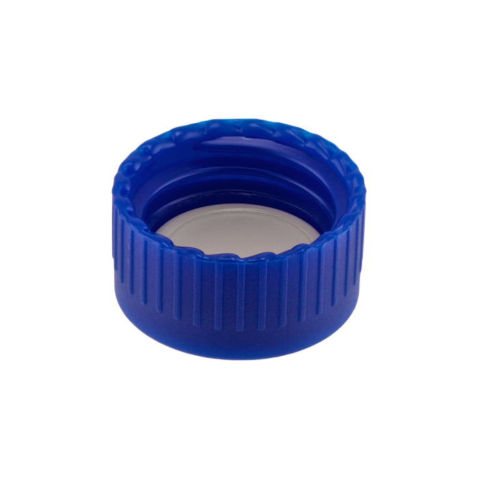Our screw top caps are designed for use with 9-425mm thread, 12x32mm autosampler vials, providing a reliable and secure seal. The non-slit, tan PTFE liner and white silicone rubber septa are bonded in knurled polypropylene blue caps, ensuring durability and ease of use.