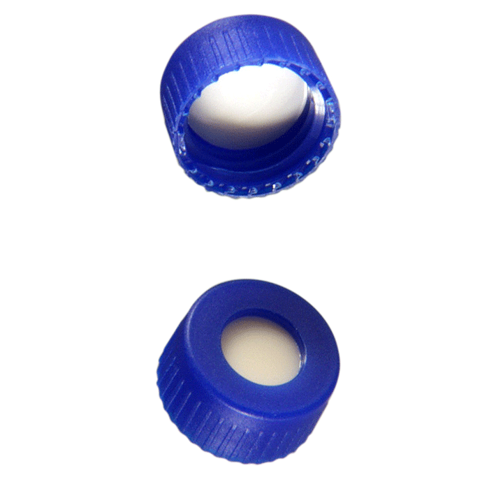 Caps, Screw Top, with Beige Silicone Rubber / White PTFE Septa, bonded in "knurled", polypropylene, Blue Caps. For use with 9-425mm thread, 12x32mm autosampler vials. MICROSOLV Brand. 100/PK
