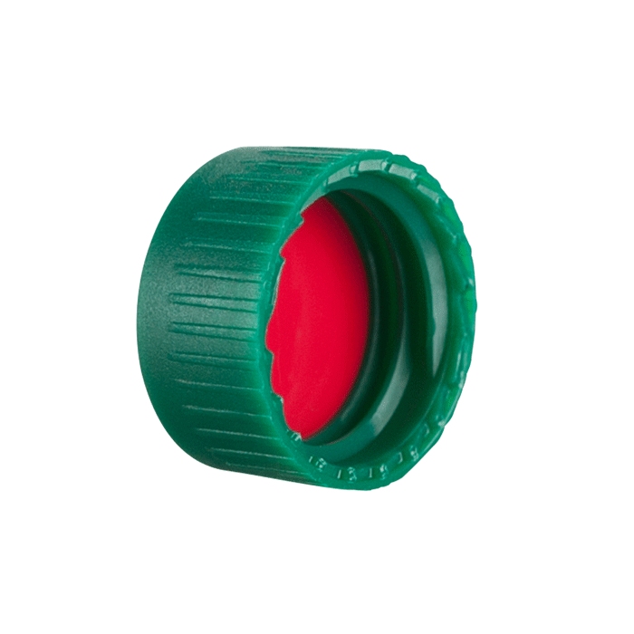 Caps, Screw Top, with Red PTFE / White Silicone Rubber / Red PTFE Septa, fitted in "knurled", polypropylene, Green Caps. For use with 9-425mm thread, 12x32mm autosampler vials. MICROSOLV Brand. 100/PK