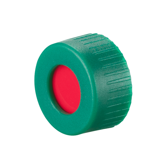 Caps, Screw Top, with Red PTFE / White Silicone Rubber / Red PTFE Septa, fitted in "knurled", polypropylene, Green Caps. For use with 9-425mm thread, 12x32mm autosampler vials. MICROSOLV Brand. 1000/CS