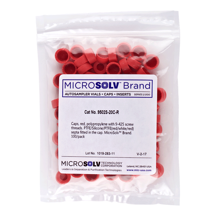 Caps, Screw Top, with Red PTFE / White Silicone Rubber / Red PTFE Septa, fitted in "knurled", polypropylene, Red Caps. For use with 9-425mm thread, 12x32mm autosampler vials. MICROSOLV Brand. 100/PK