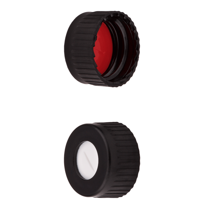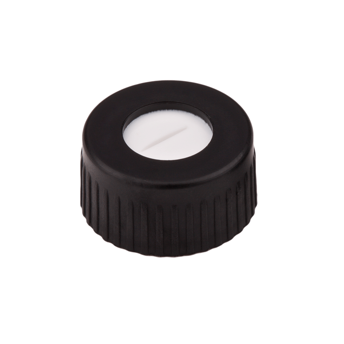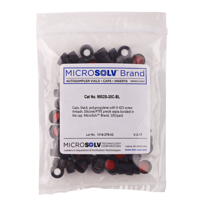 Caps, Screw Top, with Silicone Rubber / PTFE Pre-Slit Septa, bonded in "knurled", polypropylene, Black Caps. For use with 9-425mm thread, 12x32mm autosampler vials. MICROSOLV Brand. 100/PK