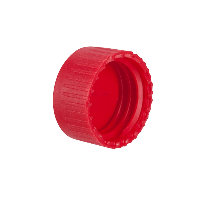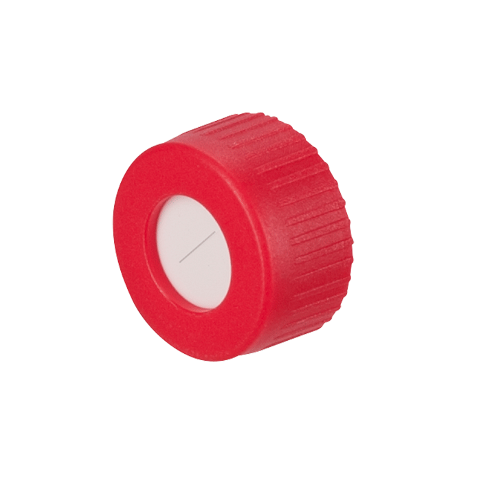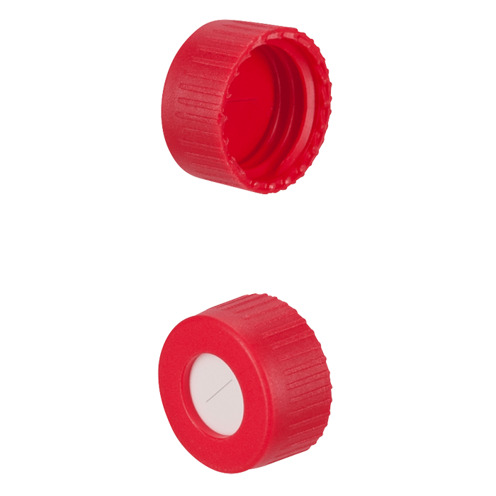 Caps, Screw Top, with Silicone Rubber / PTFE Pre-Slit Septa, bonded in "knurled", polypropylene, Red Caps. For use with 9-425mm thread, 12x32mm autosampler vials. MICROSOLV Brand. 1000/CS