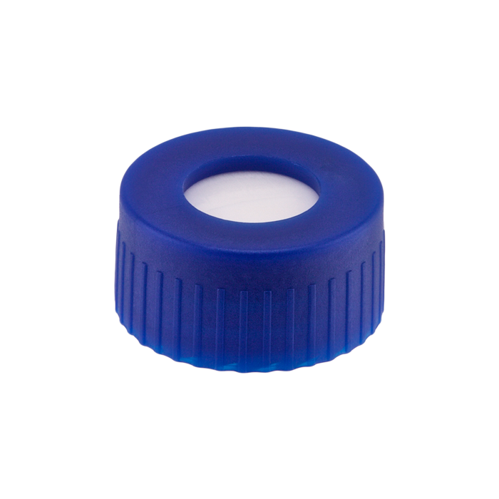 Our screw top caps are designed for use with 9-425mm thread, 12x32mm autosampler vials, providing a reliable and secure seal. The pre-slit, tan PTFE liner and White silicone rubber septa are bonded in knurled polypropylene blue caps, ensuring durability and ease of use.