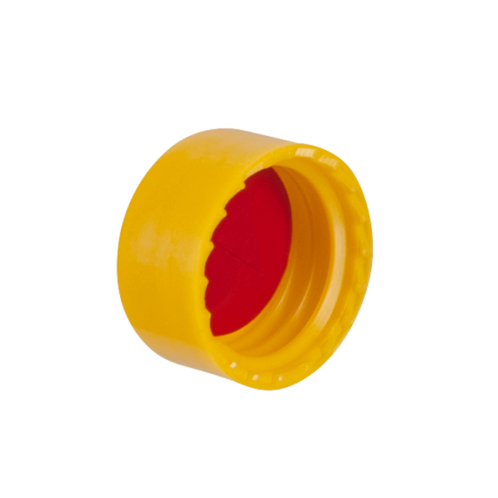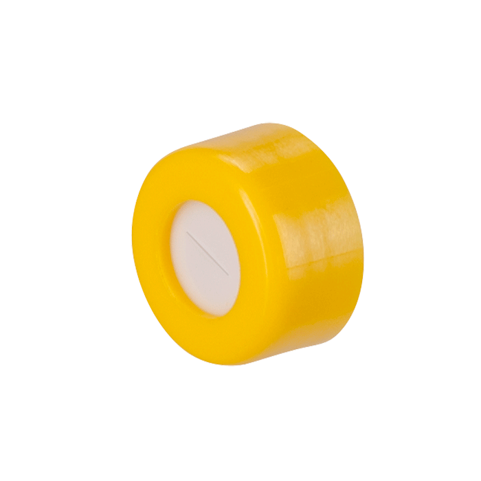 Caps, Screw Top, with Silicone Rubber /PTFE Pre-Slit Septa, fitted in a smooth sided, Robo Style Yellow Caps. For use with 9-425 thread, 12x32mm autosampler vials. MICROSOLV Brand. 1000/CS.